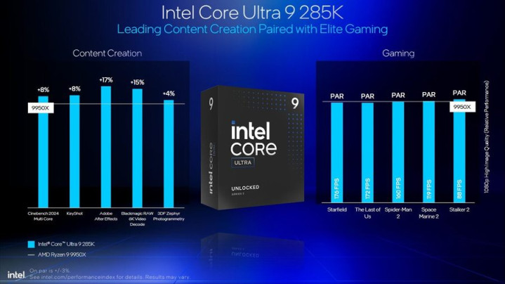 英特尔首先列出了其整个LGA1851插槽桌面处理器产品线。顶级的酷睿Ultra9系列处理器被展示为与整个高核心数的锐龙99000系列竞争。酷睿Ultra7265K/KF则与目前PC游戏最快的处理器锐龙79800X3D进行比较。非K系列的酷睿Ultra7265/265F与锐龙79700X对比。而大部分的酷睿Ultra5系列则与锐龙59600X和9600进行较量。